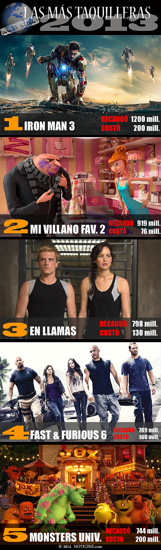 En el ranking global (ligeramente distinto del norteamericano), sigue a la secuela de la saga encabezada por Robert Downey Jr., que acumuló 1200 millones de dólares, la producción animada "Mi villano favorito 2 / Despicable 2" (918,8 millones), la otoñal "Los juegos del hambre: En llamas / The hunger games: Catching fire" (797,5 millones), "Fast & Furious 6" (788,7 millones), y "Monsters University" (743,6). Según los datos oficiales de los estudios, de todas ellas sólo una, "Mi villano..." costó menos de 100 millones de dólares (76).